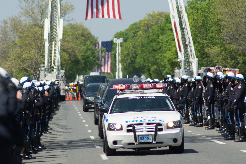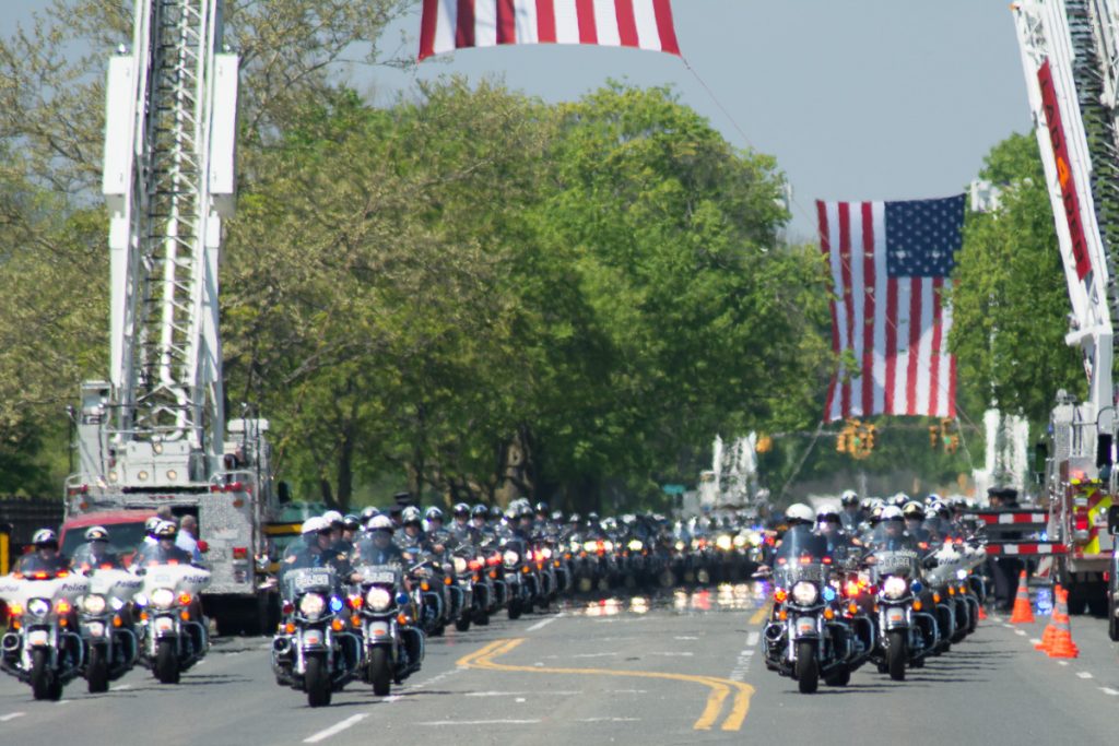 All along the funeral route, dozens of fire trucks from all over Long Island were set up with their arched ladders draping American Flags over the roadway.