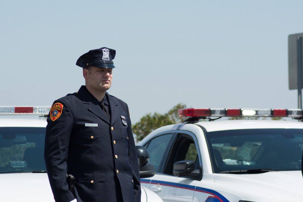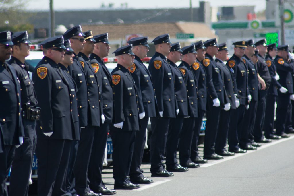 A sea of blue surrounded the church and inside “Amazing Grace” was played by bagpipers as the flag draped casket was carried outside, passing thousands of officers standing at salute.