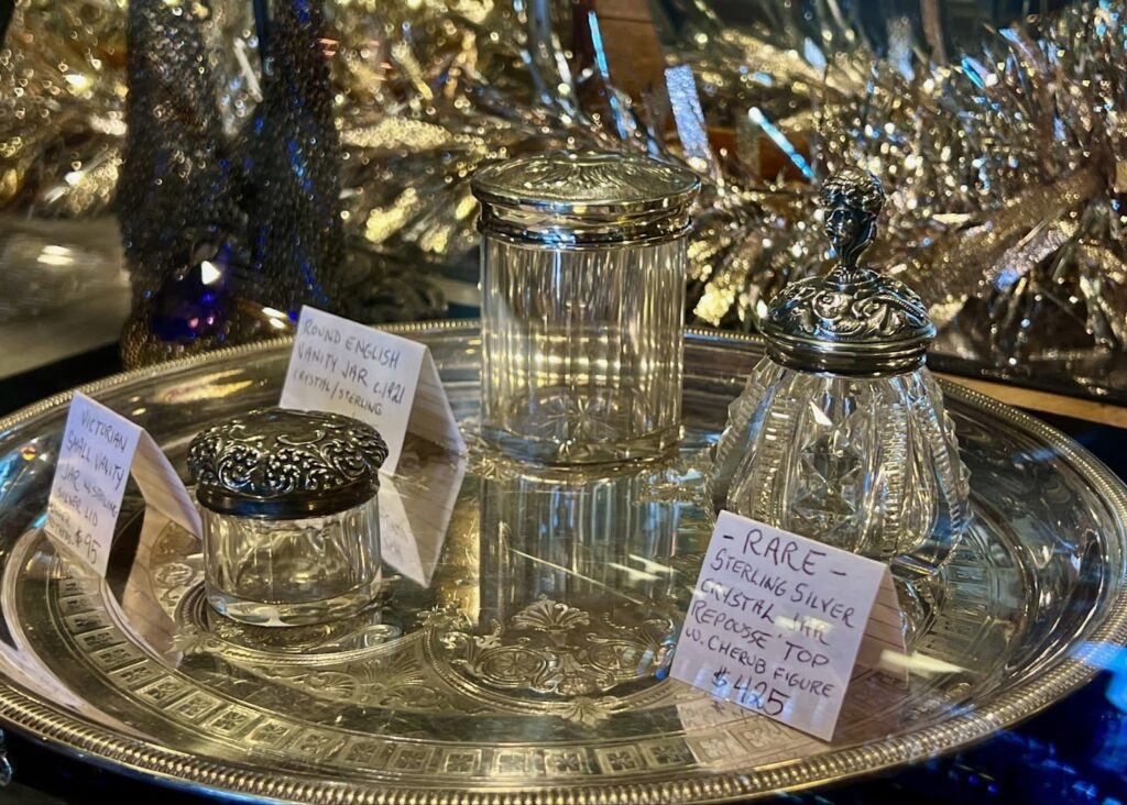 Carrying on around the store on her search for an answer, Weiss found more examples of items she considered trinkets. “I have Victorian dresser drawers. I think those would be trinkets also. They’re small and most of them have a sterling silver top. And I found a case that has some stuff in it, very small perfume bottles… I think those would fit into the category also.”